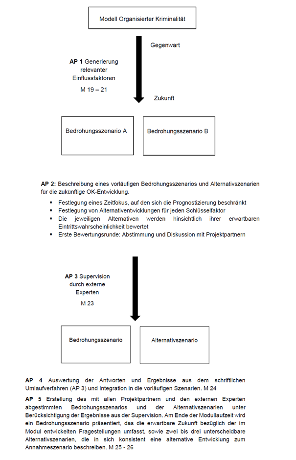 Mit Modul 6 wird ein Bedrohungsszenario präsentiert, das die erwartbare Zukunft bezüglich der im Modul entwickelten Fragestellungen umfasst, sowie zwei bis drei unterscheidbare Alternativszenarien, die in sich konsistent eine alternative Entwicklung zum Annahmeszenario beschreiben.